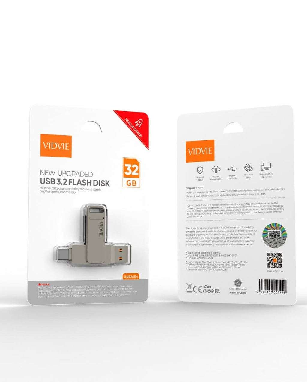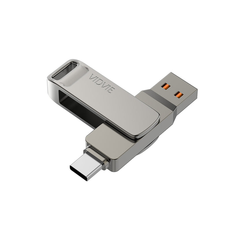 - La memoria VIDVIE 32GB con doble interfaz USB-A y Tipo-C es la solución perfecta para quienes necesitan transferir datos entre múltiples dispositivos de forma rápida y segura. Con un diseño metálico resistente y elegante, esta unidad ofrece compatibilidad total con computadoras, smartphones, tablets y laptops modernas. Su mecanismo giratorio protege los conectores y facilita el transporte gracias a su aro integrado.
