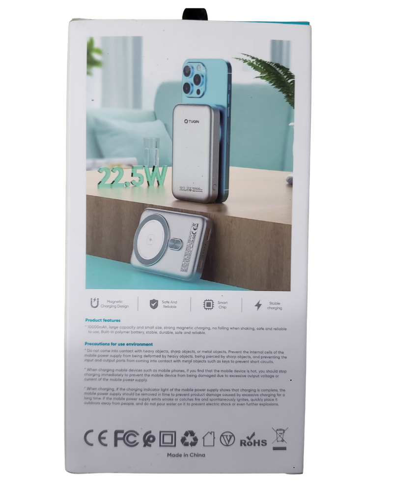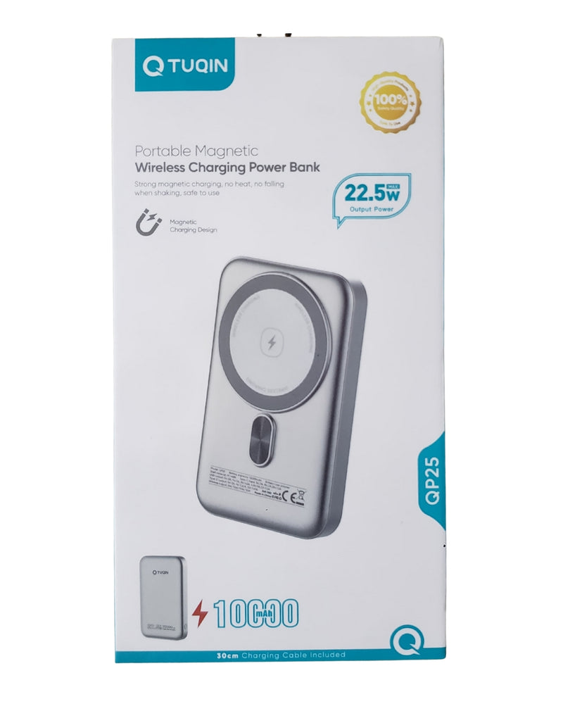 - Mantén tus dispositivos cargados en todo momento con el Power Bank TUQIN QP25 de 10,000mAh con tecnología Magsafe. Diseñado para ofrecer una carga rápida y segura, cuenta con múltiples salidas para adaptarse a diferentes dispositivos. Su diseño compacto y moderno lo convierte en el aliado perfecto para el uso diario o en viajes. Fabricado con materiales resistentes y un núcleo de batería de polímero, garantiza eficiencia y durabilidad.